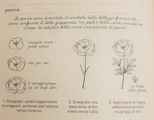 Il libro, dopo una rapida parte introduttiva focalizzata sulle nozioni e i materiali basilari (penne, gomme, matite…), prosegue in maniera piuttosto schematica: sulla pagina di sinistra troviamo le indicazioni per ritrarre piante e animali, con degli esempi; su quella di destra, invece, abbiamo delle piccole scene da completare (niente paura: bisogna ricalcare le linee guida e il gioco è fatto). La selezione di soggetti da immortalare è abbastanza ampia, comprendendo fiori di diverse varietà, insetti, alberi, frutti, boccioli… Il testo ospita anche alcune mini sezioni che approfondiscono questo o quel tema; una è dedicata alle composizioni floreali, un’altra ai motivi grafici con cui decorare lettere e cartoline, e così via.